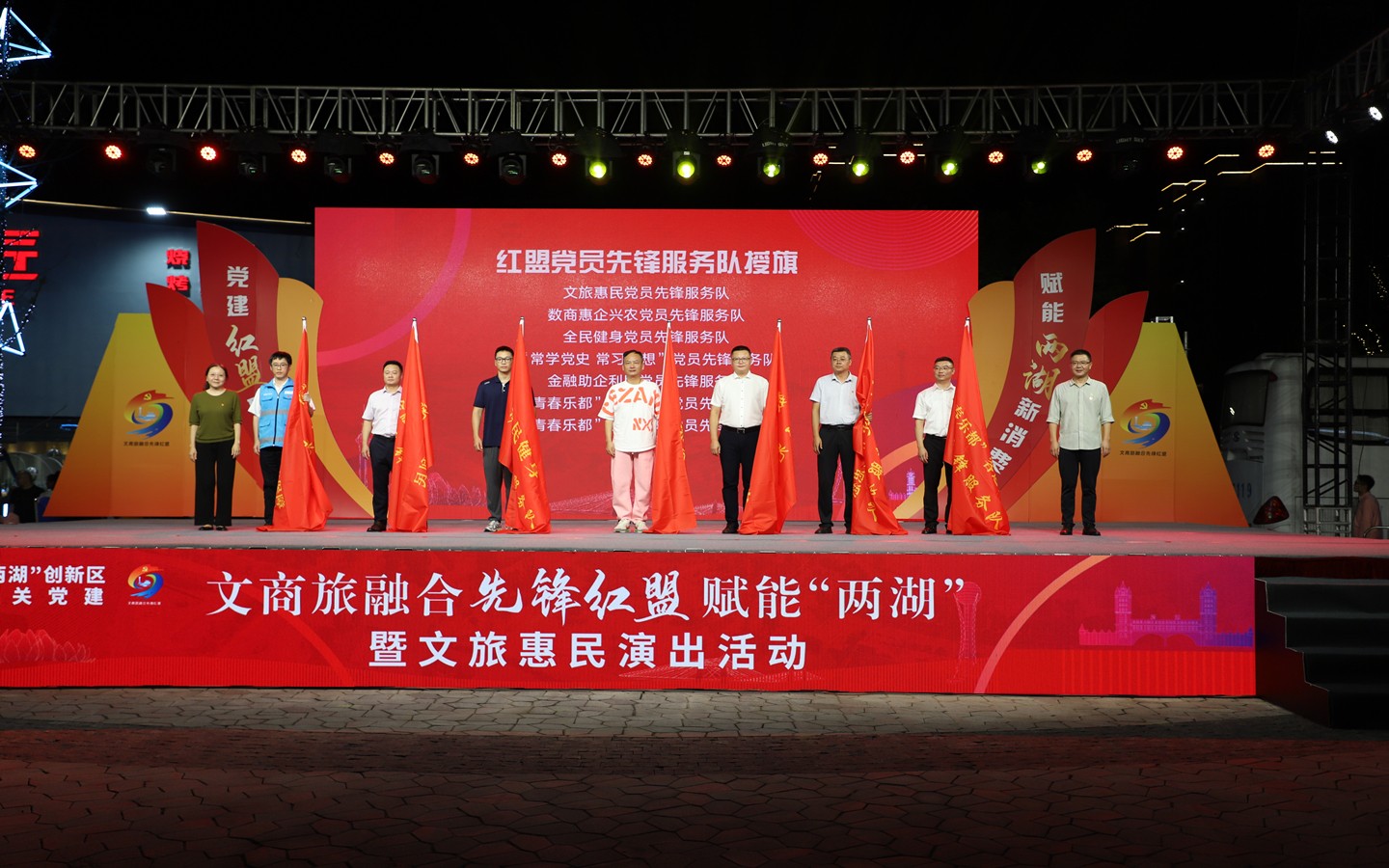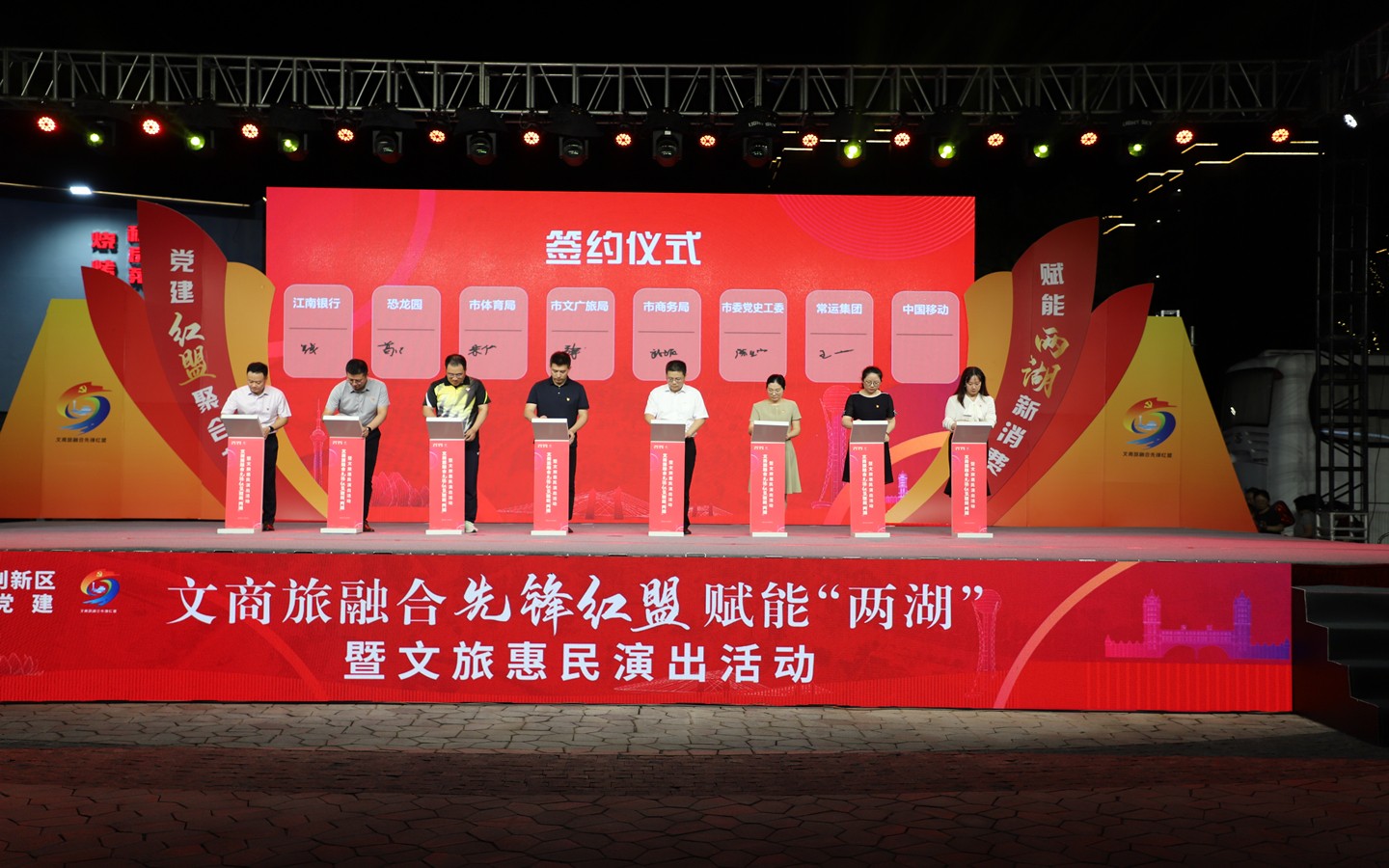活动现场,集团机关党支部作为“红盟助力街区夜消费”重点项目党支部参加共建签约,成立的“青春乐都”客运保障党员先锋服务队参加了现场授旗仪式。现场还发布了《“两湖”创新区文商旅融合先锋红盟行动方案》以及“两湖”创新区夜间文商旅消费集聚区典型案例,集团转型开发项目——蓝海豚文化艺术街区上榜。