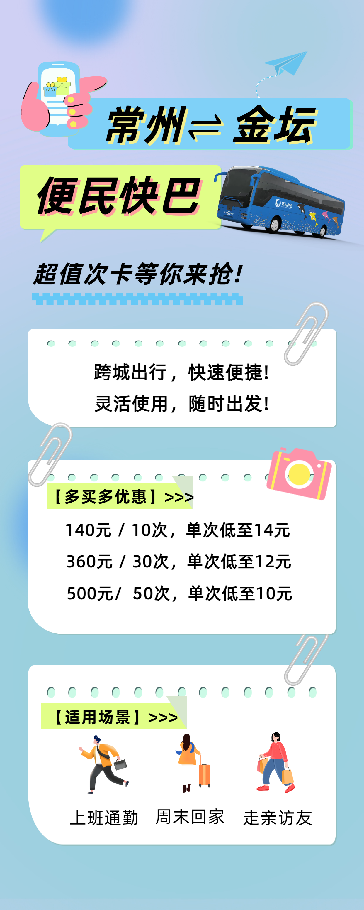 为进一步提升出行体验,常州至金坛便民快巴近日推出超值次卡,为广大市民提供更加优惠、便捷的出行选择。此次推出的次卡共分为三档:140元10次、360元30次、500元50次,具体购买及使用方式可关注“常州汽车站”公众号了解详情。